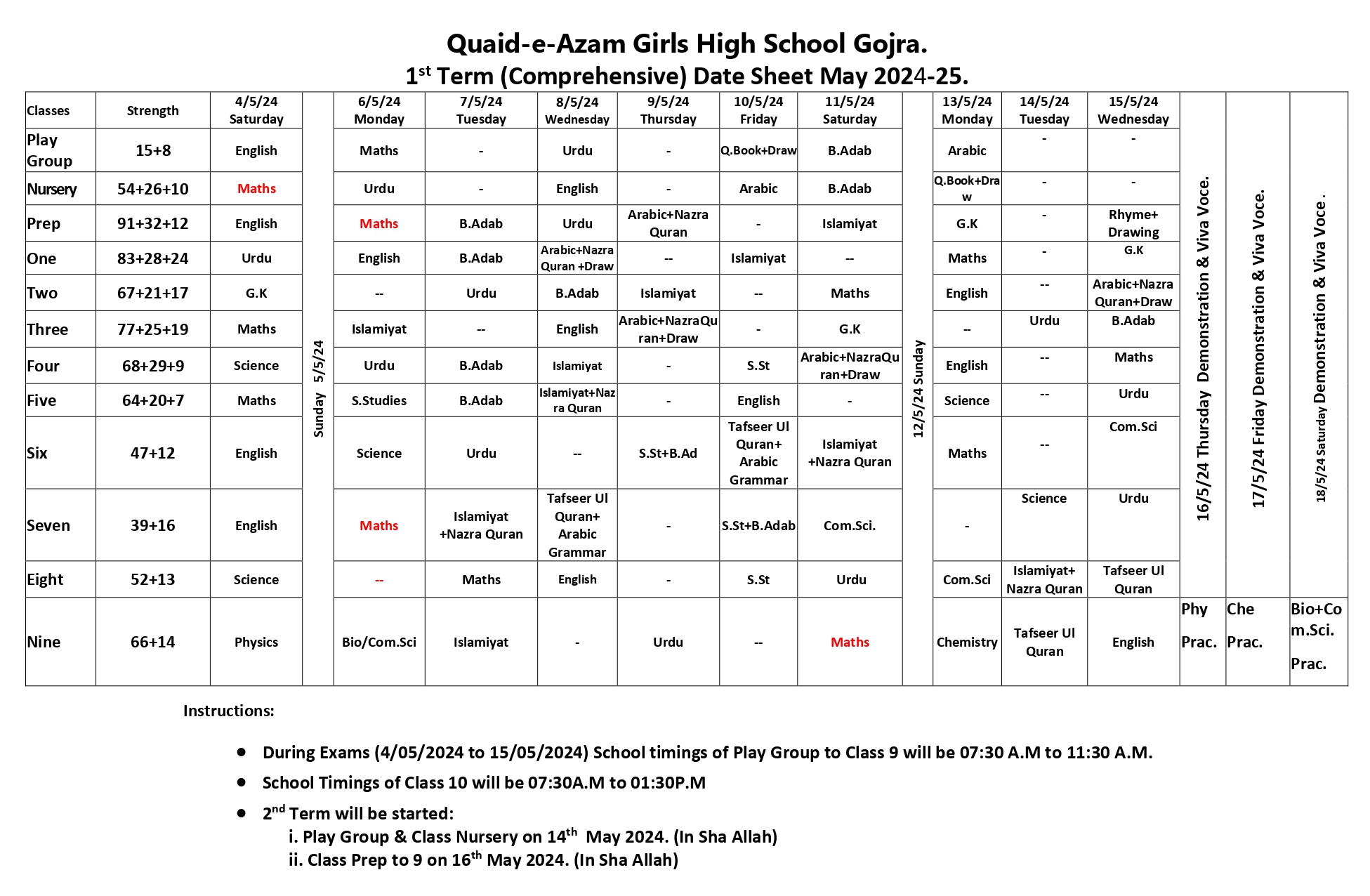 1st Term (Comprehensive) Date Sheet May 2024-25 Download