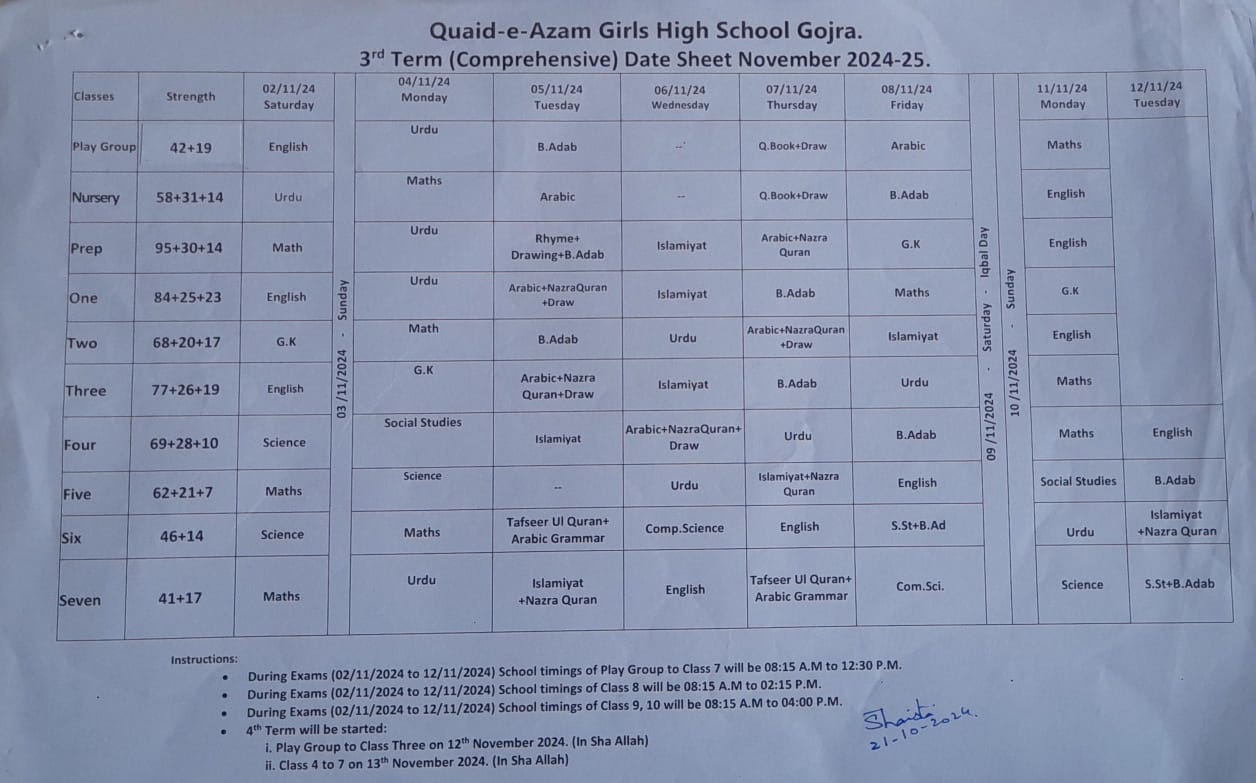 3rd Term (Comprehensive) Date Sheet May 2024-25 Download